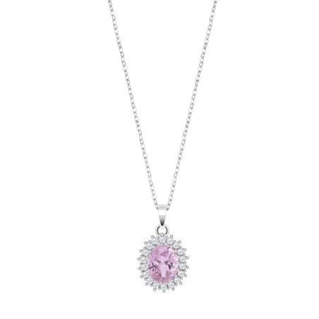 Collana in argento 925 con pendente con zircone centrale rosa di forma ovale contornato di zirconi trasparenti
