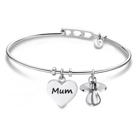 Bracciale in acciaio con pendente a forma di ciuccio + pendente a forma di cuore