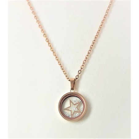 Collana in acciaio rosè + pendente tondo con all'interno stella e zirconi trasparenti