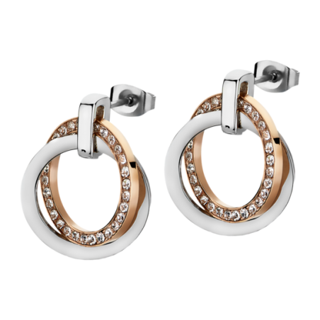 Orecchini pendenti doppio cerchio intrecciato di cui uno in acciaio rosè con strass bianchi
