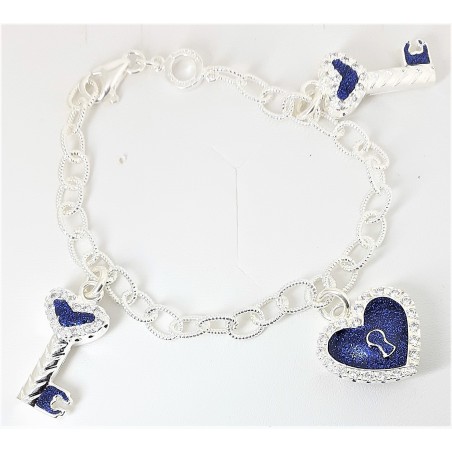 Bracciale in bronzo con pendente cuore e pendenti chiave con smalto blu effetto glitter e strass bianchi