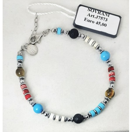 Bracciale da uomo con chiusura e catenella di regolazione in argento 925, elementi in metallo e pietre multicolore