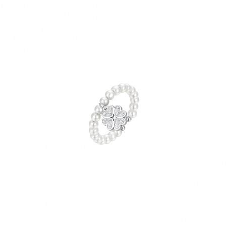 Anello in acciaio con perline sintetiche bianche e pendente a forma di quadrifoglio con strass