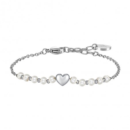 Bracciale in acciaio con cuore centrale e perline sintetiche bianche