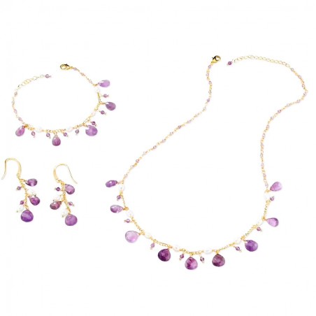 Collana + bracciale + orecchini in bronzo dorato con perle di acqua dolce e ametiste